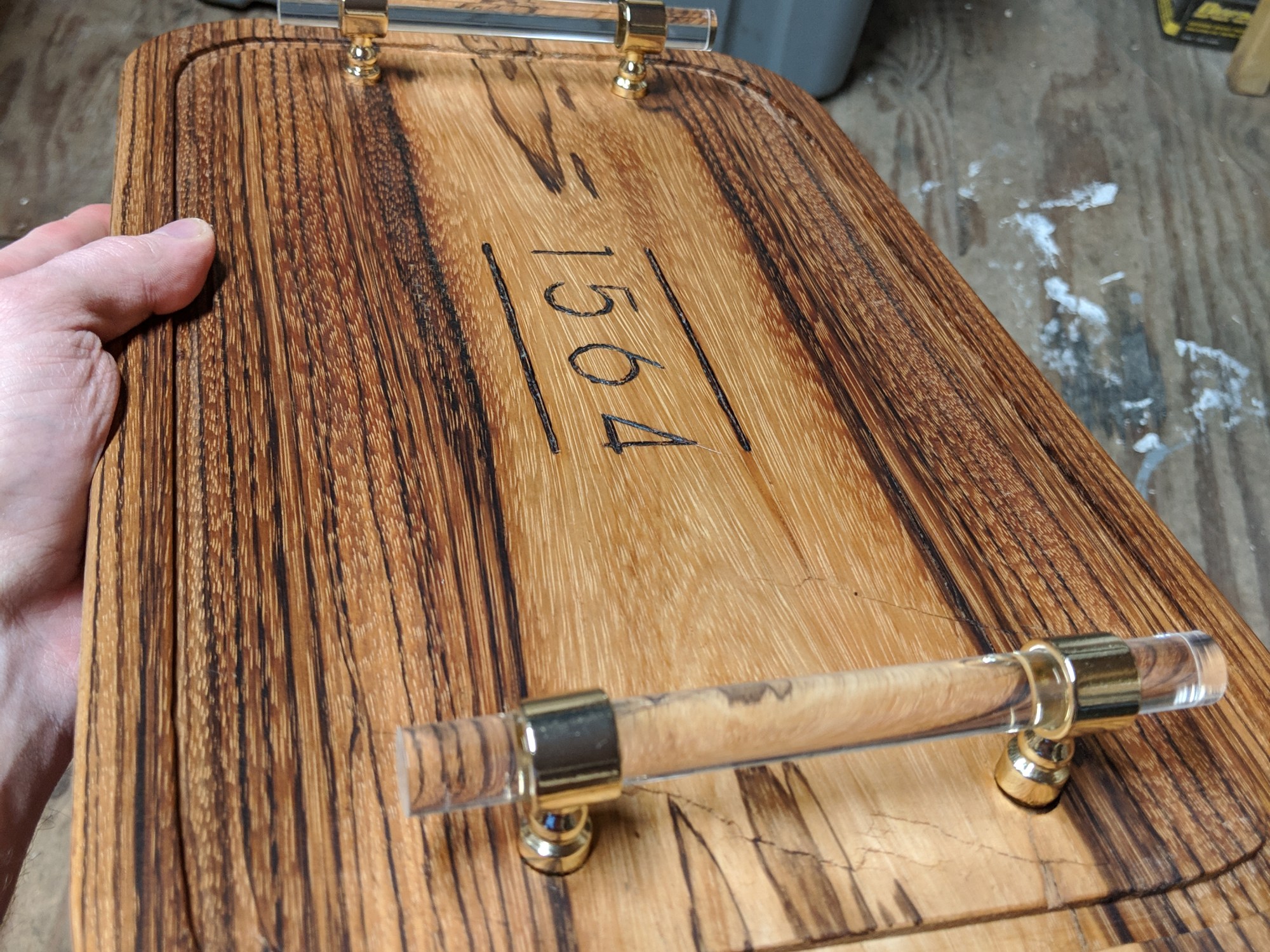 Zebrawood serving tray with “1564” engraved and burned into the center. Lucite handles affixed with counter-sank and plugged screws, and a moat dug around the perimeter for anything served that would be juicy or runny.
